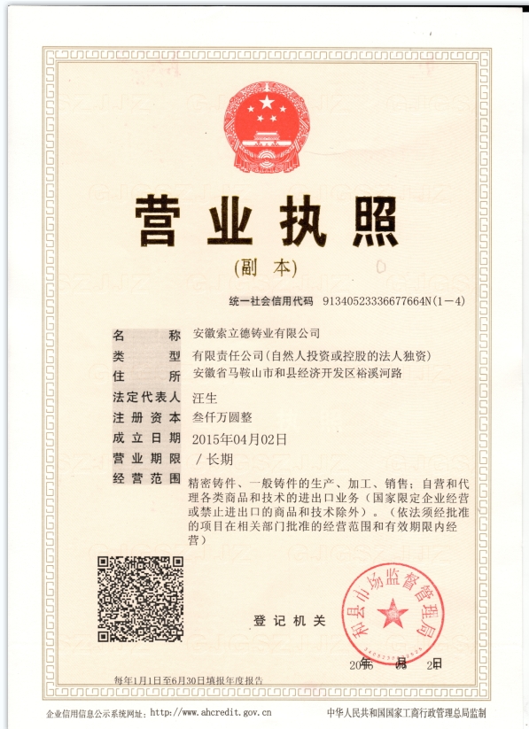 安徽索立德鑄業有限公司 位于馬鞍山市和縣經濟開發區,公司成立于1992年,主要致力高品質的鑄件生產,經過不斷發展壯大,于2015年擴大生產規模,新廠于2015年8月份投產,總投資2億人民幣,砂鑄廠房建筑面積60000㎡,擁有呋喃、堿酚醛樹脂砂生產線各2條(包含40t/h移動式混砂機,20t/h及10t/h固定式混砂機)0.5T/1T/2T/3T/6T中頻電爐各2臺,15T保溫爐1臺;各類拋丸機及熱處理設備等多臺套鑄造設備,同時具備完善的檢測能力。